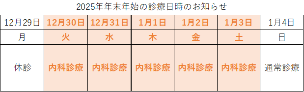 2025年12月30日(火)~2026年1月3日(土)は内科診療となり、通常診療時と診療科が異なりますので、ご注意ください。