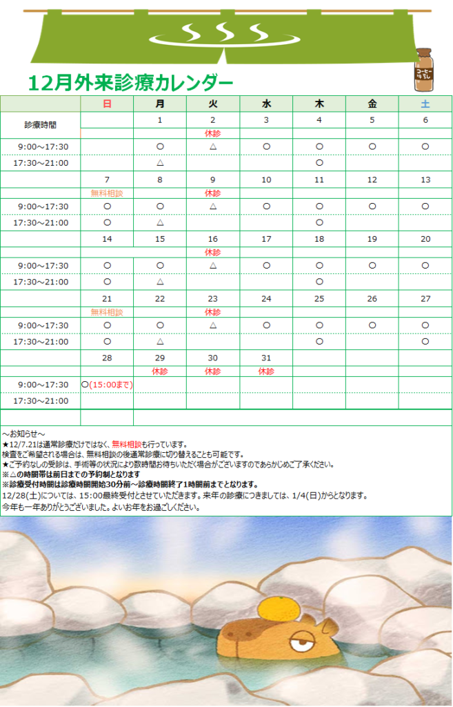 12月の診療時間と最終受付時間をお知らせいたします。