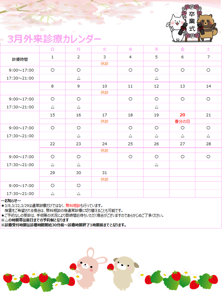 3月の診療時間と最終受付時間をお知らせいたします。